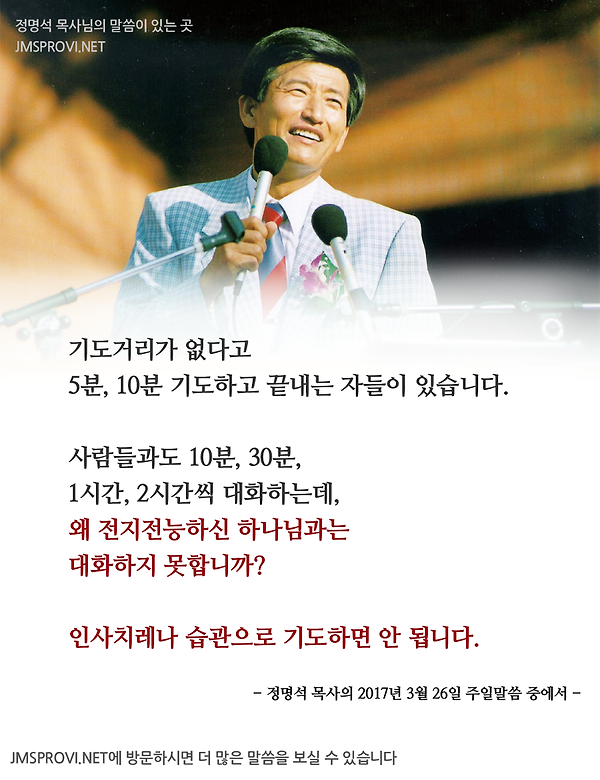 주제별말씀 기도할 내용이 없습니까? 다시 한번 생각해 보기 바랍니다. [정명석 목사의 주제별 말씀]jms 기도거리가 없다고 5분, 10분 기도하고 끝내는 자들이 있습니다. 사람들과도 10분, 30분, 1시간 2시간씩 대화하는데,왜 전지전능하신 하나님과는 대화하지 못합니까? 인사치레나 습관으로 기도하면 안 됩니다. - 정명석 목사의 2017년 3월 26일 주일말씀 중에서 -