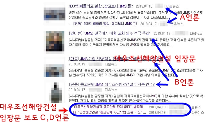 그와 반대로 C언론은 『 "대우조선해양건설과 종교단체 관계 없다"…법적대응 준비』, D언론은 『대우조선해양건설 "종교단체 자금유입 소문 거짓" 반박』이라고 보도한 것.