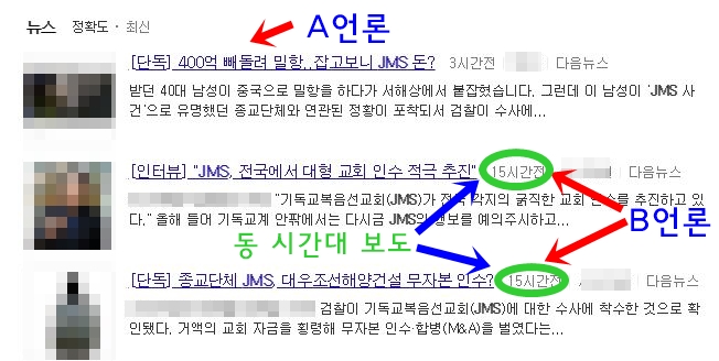 지난 4월17일과 18일 A언론은"400억 빼돌려 밀항...잡고 보니 JMS 돈?"이라고 2회 보도했고, B언론은4월17일 종교단체 JMS, 대우조선해양건설 무자본 인수? 과 "JMS, 전국에서 대형 교회 인수 적극 추진"이라고 2회, 4월19일 "JMS 기업 사냥 핵심 인물들 본지 취재 시작하자 출국"이라고 1회, 3일 사이에 3회 보도했다.