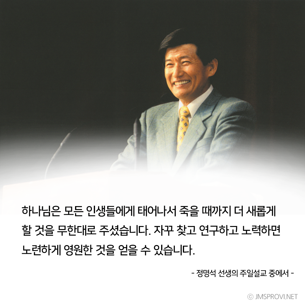 정명석목사설교/주제별말씀 하나님이 인간에게 무한대로 주신 것이 있다면 하늘과 나 2021. 1. 17. 07:00 하나님은 모든 인생들에게 태어나서 죽을 때까지 더 새롭게 할 것을 무한대로 주셨습니다. 자꾸 찾고 연구하고 노력하면 노련하게 영원한 것을 얻을 수 있습니다. 공유하기 게시글 관리 JMS 정명석 목사에 대한 진실 '정명석목사설교/주제별말씀' Related Articles 하나님이 온전하심과 같이 너희도 온전하라(마태복음 5장 48절) 일을 해결하는 방법 2021년 새해! 잘되기를 바란다면 해야할 한 가지 방법 모르는 자가 모르는 것을 벗어나는 방법